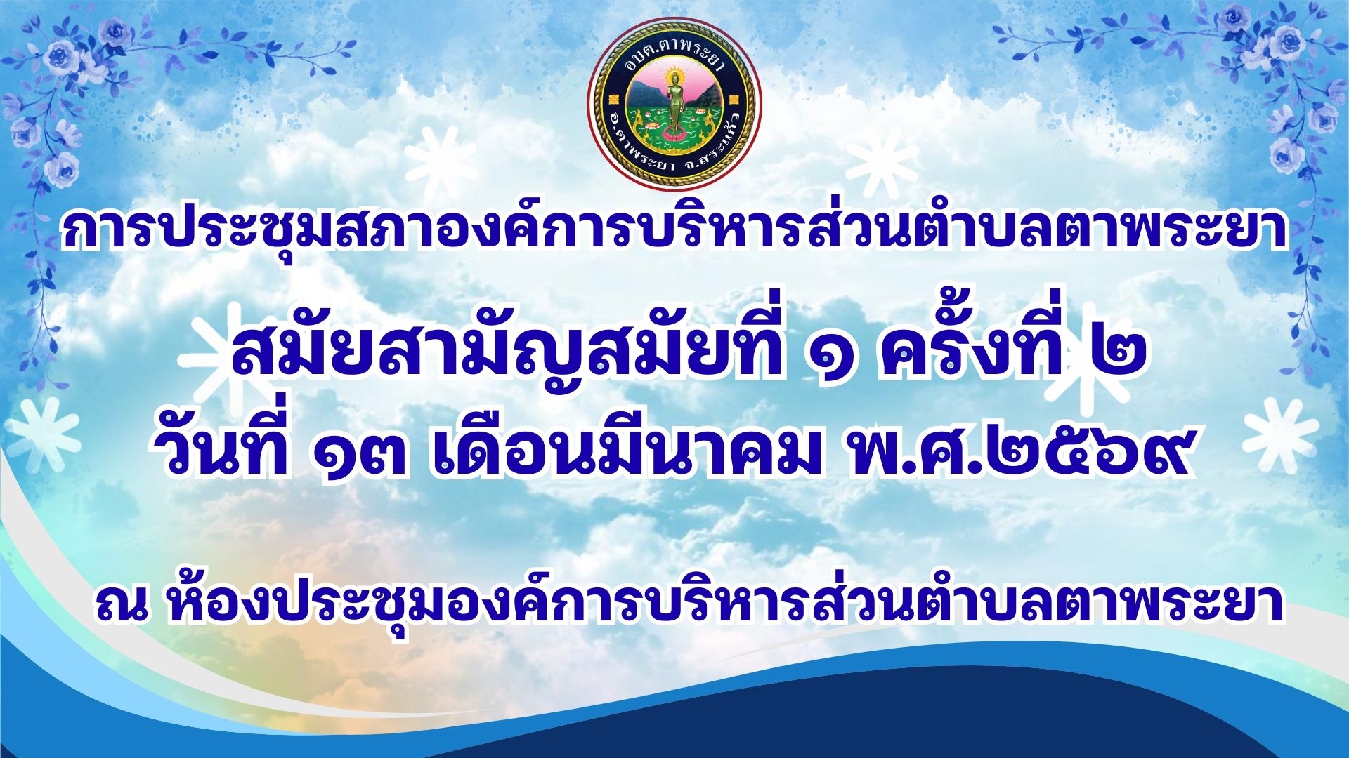 องค์การบริหารส่วนตำบลตาพระยา จัดการประชุมสภาองค์การบริหารส่วนตำบลตาพระยา สมัยสามัญ สมัยที่ 1 ครั้งที่ 2 เพื่อพิจารณาและหารือข้อราชการต่าง ๆ ที่เกี่ยวข้องกับการพัฒนาท้องถิ่น รวมถึงการดำเนินงานตามภารกิจของ อบต. ให้เป็นไปอย่างมีประสิทธิภาพ โปร่งใส และเกิดประโยชน์สูงสุดต่อประชาชนในพื้นที่ตำบลตาพระยา