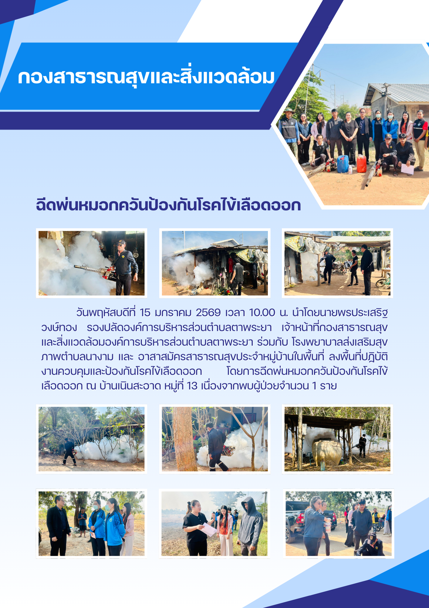 กองสาธารณสุขและสิ่งแวดล้อม ฉีดพ่นหมอกควันป้องกันโรคไข้เลือดออก บ้านเนินสะอาด หมู่ 13 |